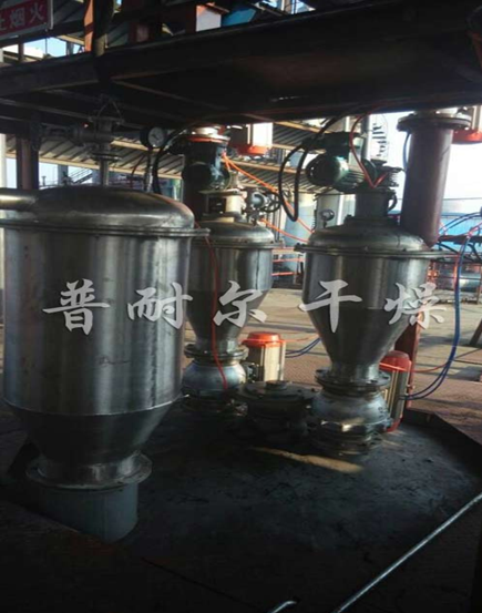 干燥完的物料在耙刀作用下进入气动球阀e的进口,气动球阀e与h同时打开,干物料进入出料过渡料仓1内,出料过渡料仓2内的物料通过气动球阀h出到干燥机外,同样,干燥完的物料在耙刀作用下进入气动球阀g的进口,气动球阀g与f同时打开,干物料进入出料过渡料仓2内,出料过渡料仓1内的物料通过气动球阀h出到干燥机外,如此反复,干物料连续出到干燥机外包装。